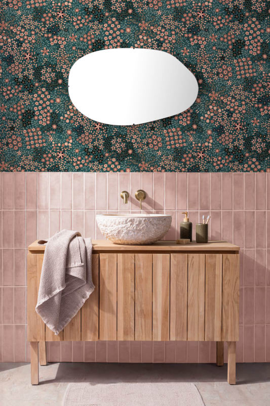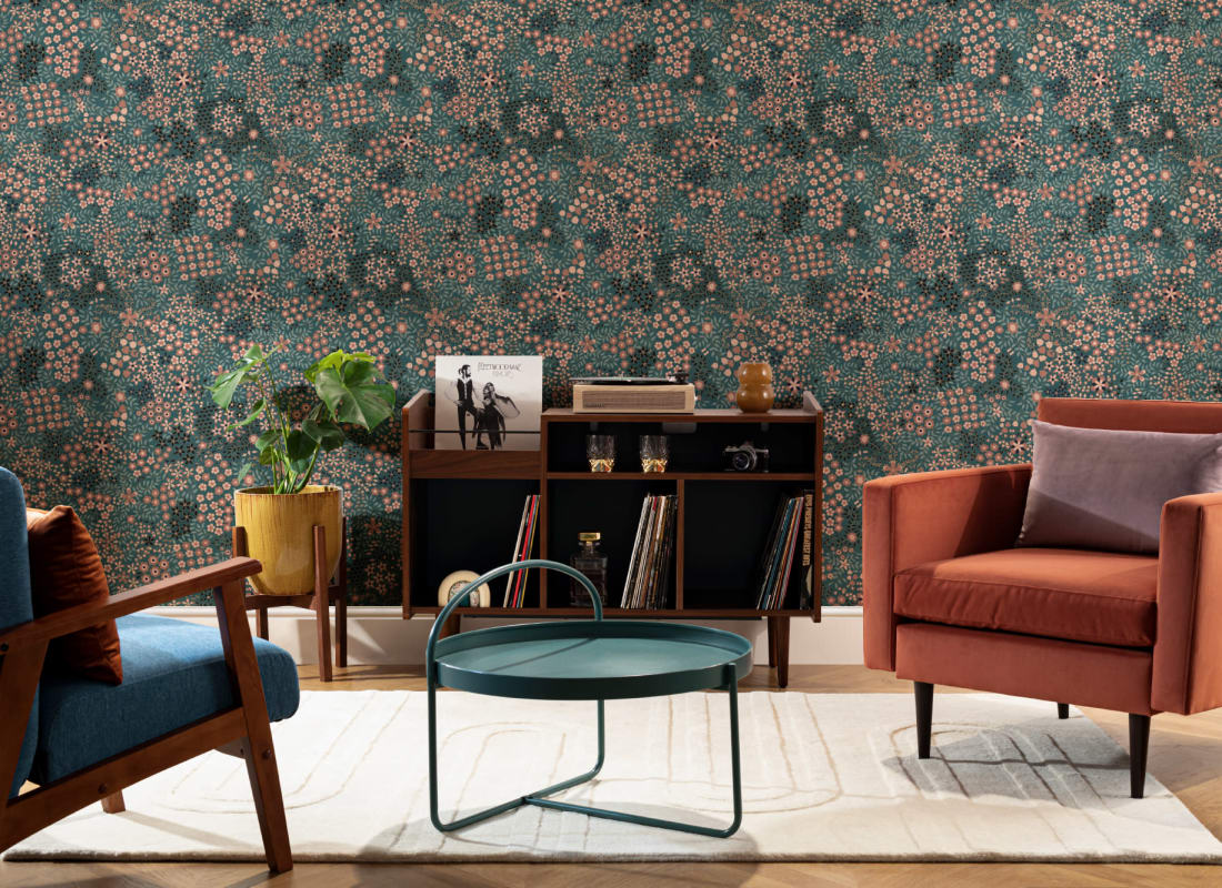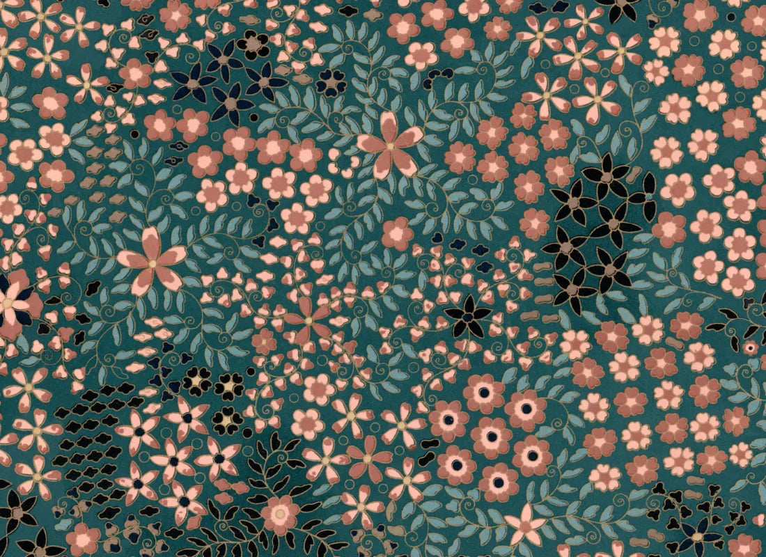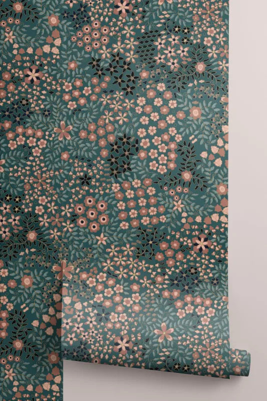 Originating from G.A. Audsley's 1884 Japanese floral prints, this wallpaper features warm pink flowers set against a deep, rich blue background. Ideal for darker, moodier rooms and with a grainy texture enhancing its historic charm, Audsley is a perfect choice for adding a pop of color and pattern and ideal for those looking to make a bold statement.
