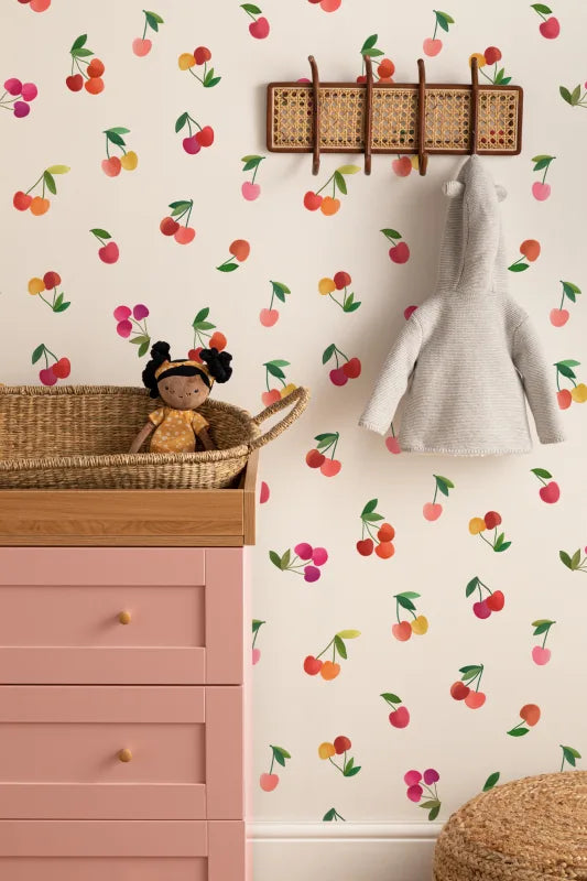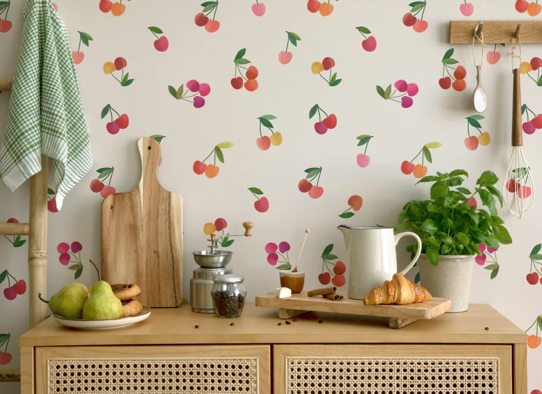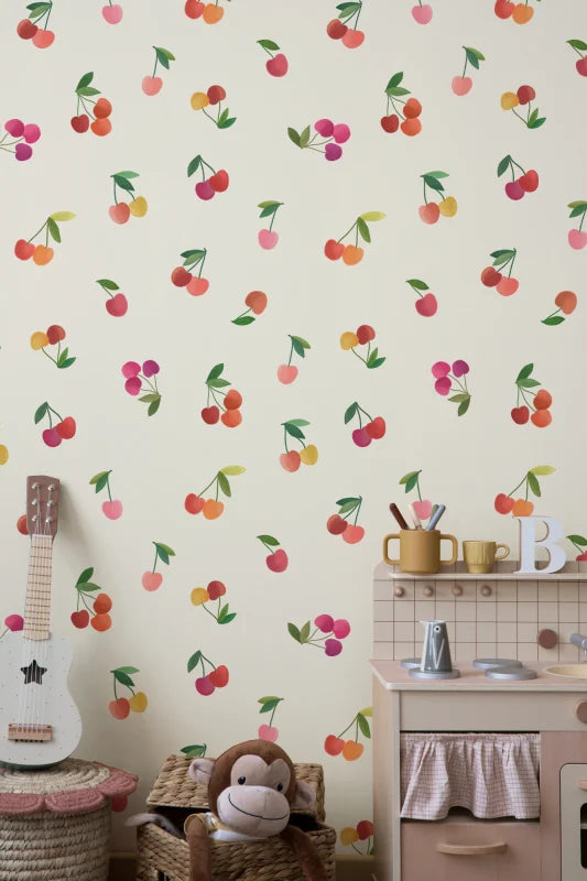 Bring a burst of playful charm to your walls with our Cherry wallpaper. Hand-drawn juicy cherries scattered across a warm beige background in pastel tones and soft watercolor textures create a cheerful and lively design. Perfect for kitchens, playrooms, or whimsical bedrooms, this wallpaper adds a fresh and inviting atmosphere, turning your walls into a vibrant, eye-catching focal point.