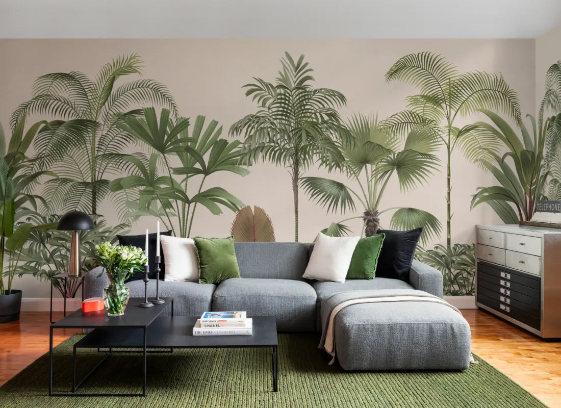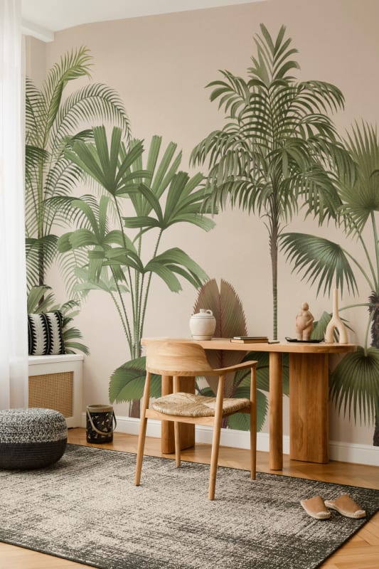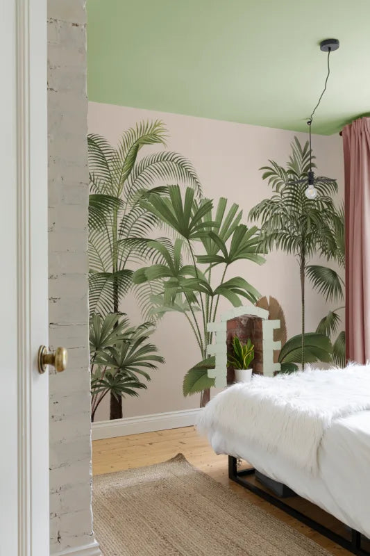 Glow Green is where vintage charm meets lush greenery. Featuring layered palms in classic botanical style, this mural balances soft tonal depth with tropical flair. The neutral green tones make it versatile for everything from minimalist bedrooms to maximalist lounges.