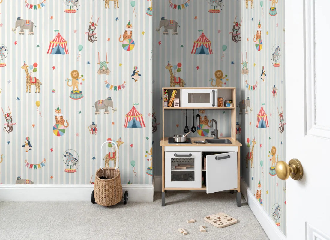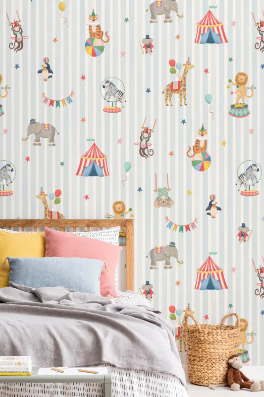 Transform your child's space into a whimsical circus with our blue-themed mural, featuring playful lions, charming elephants, and enchanting tents. The delightful designs spark imagination, full of vibrant colors and lively characters that bring a joyful and adventurous spirit to any room. Enjoy the magic of the big top, wrapped in an atmosphere of creativity and wonder.