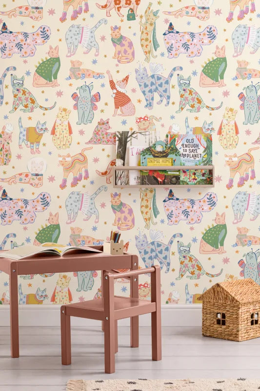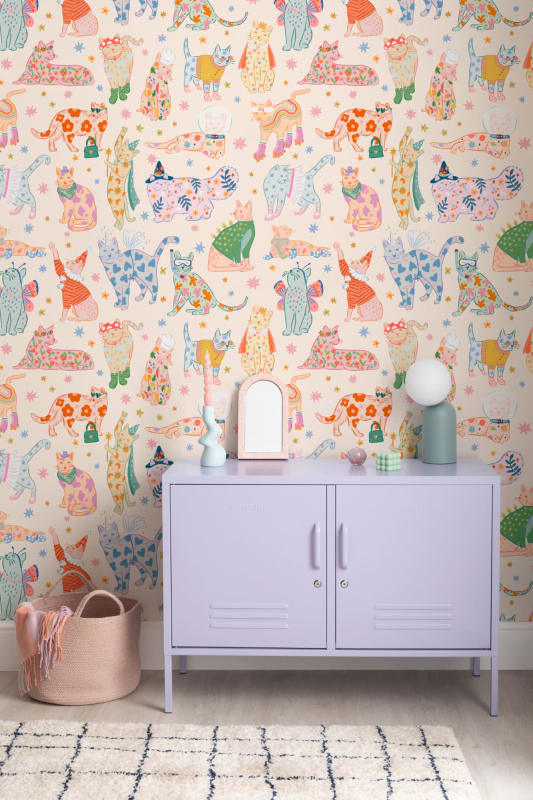 This large scale mural is a charming fusion of eclectic and maximalist styles. Rich pastels and lively hues of green, blue, and pink set a bright yet soothing tone. A variety of quirky cats, each donning unique patterns and accessories, sit amongst stars and flowers. Perfect for a child's bedroom or even a cozy reading nook, Meow promises to fill any space with playful energy and a dash of feline magic.