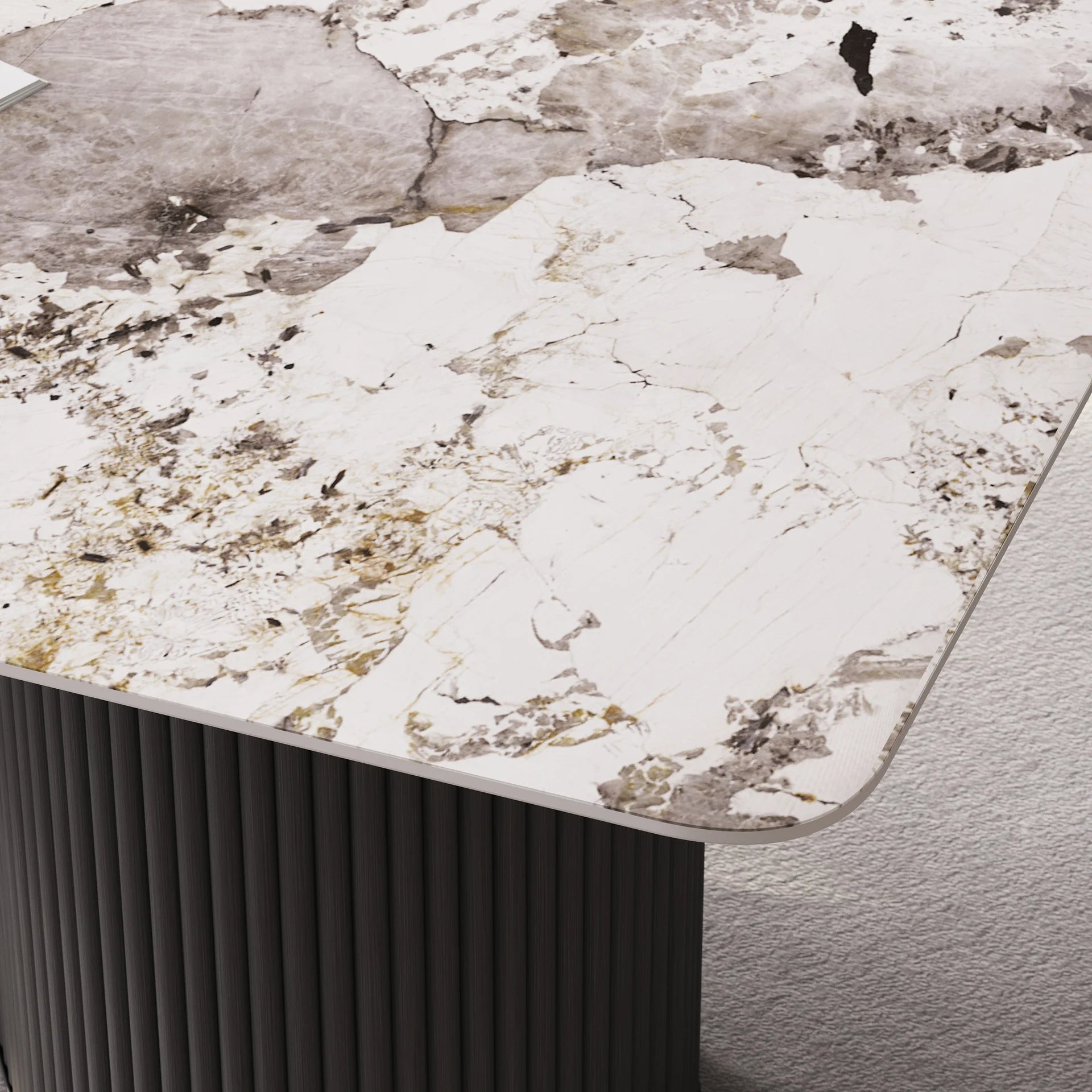 Add style and functionality to any dining room with this sleek,. Featuring an elegant white premium marble top and a black stainless steel base for stability, this table skillfully fuses fashion and strength. The rectangle design combined with its extendable feature makes this dining table perfect for entertaining 8 guests on any occasion, whether intimate family meals or large events. Its modern aesthetics and practical functions create a centerpiece in the dining room.