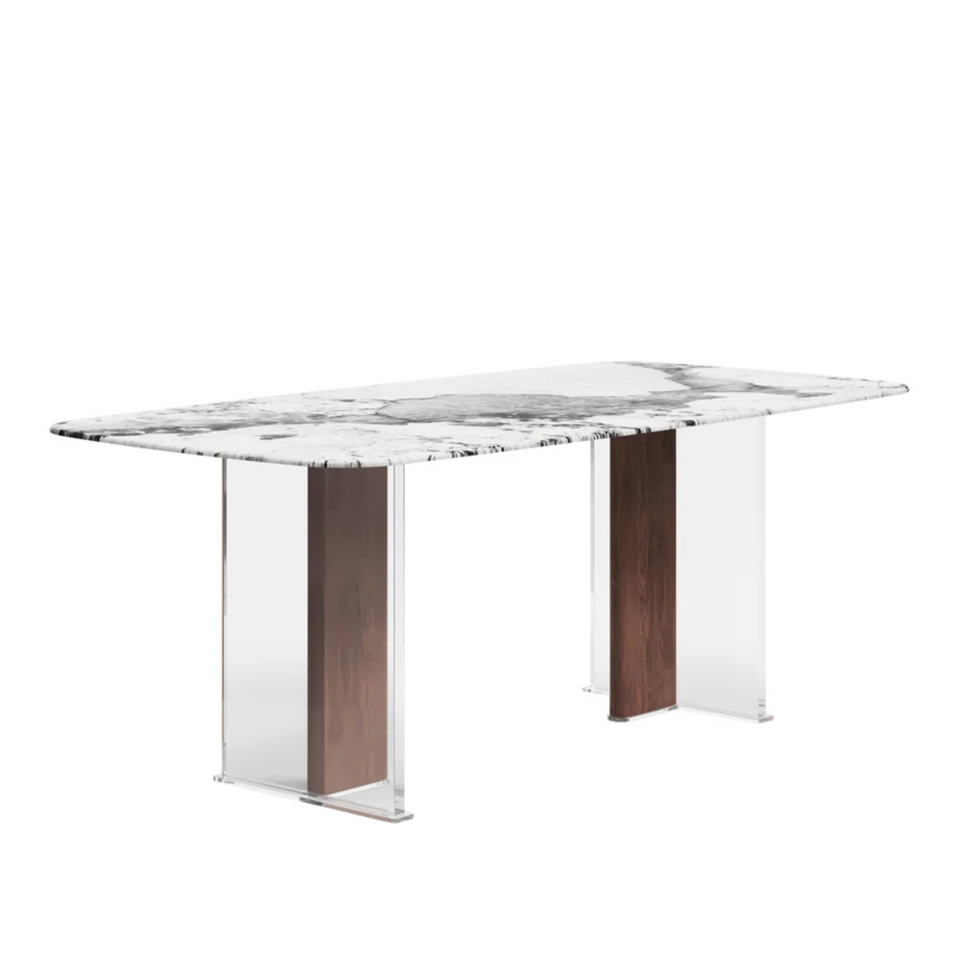 This modern dining table is sure to bring both fashion and function to any dining room. The sleek sintered marble top is scratch and heat resistant, making it perfect for daily use and festive gatherings. Elegant black walnut and wood finish with a double pedestal base provides an ultra-contemporary look for any dining room. It can seat up to 6 guests comfortably, allowing ample space to enjoy meals with your family or to entertain friends. A perfect blend of durability and modern design.
