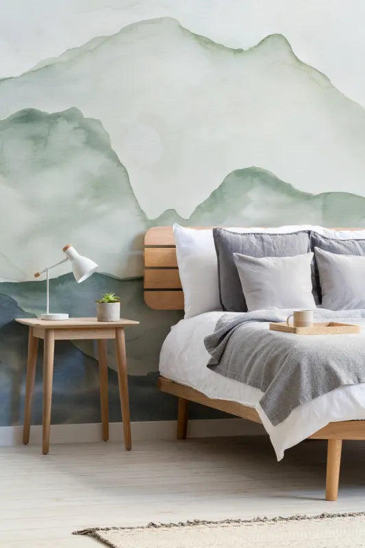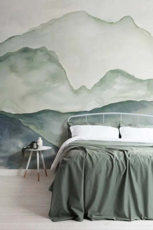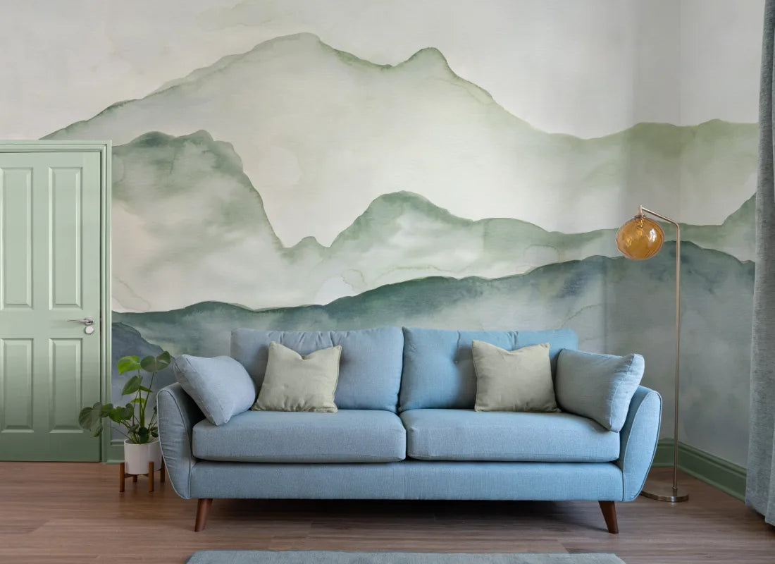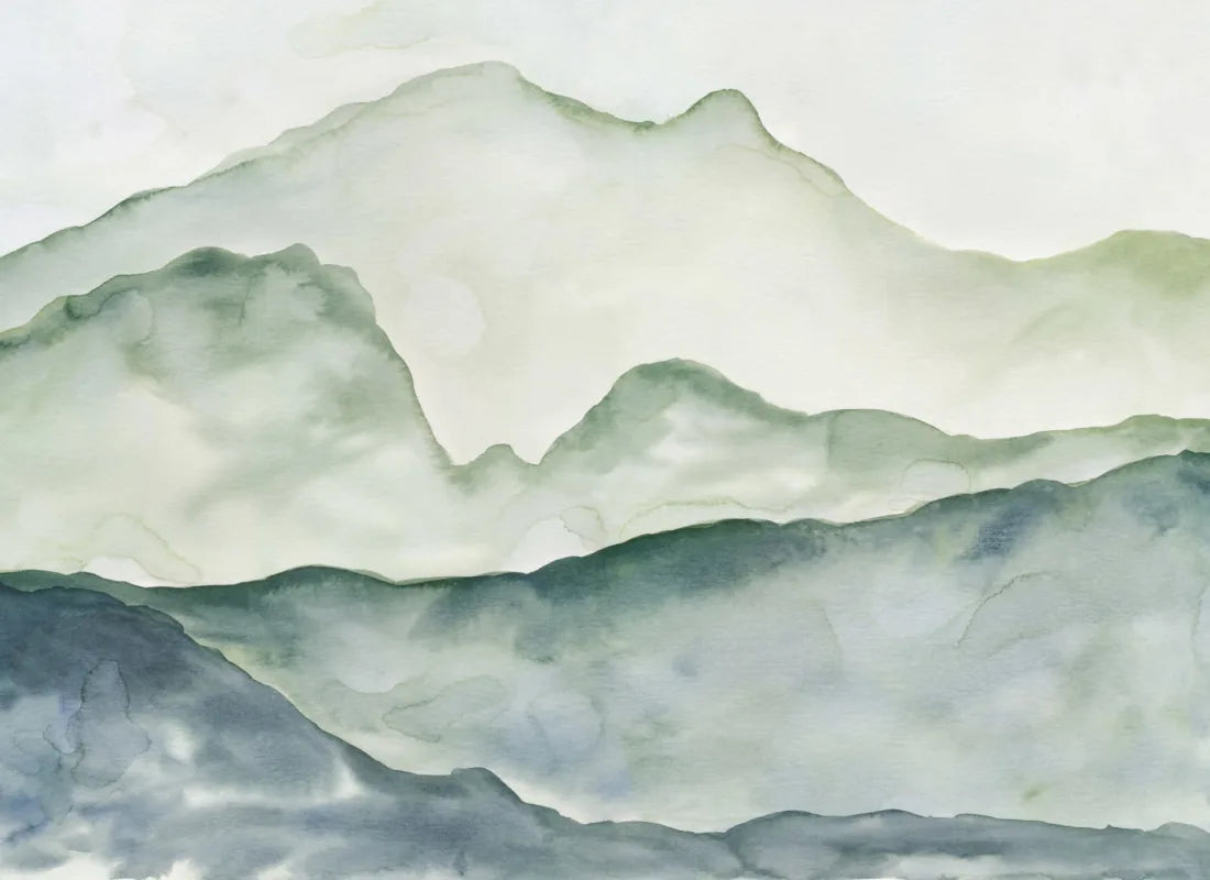 Create the perfect sanctuary for relaxing in your home with this Blue and Green Peaceful Mountainscape Wallpaper Mural. This bespoke wallpaper has been created by our in-house designer using creative watercolor techniques, and this combined with the paper textures creates a design full of depth and intrigue. The use of two soft tones keeps the mural minimal enough to work in a range of spaces, creating a calming mood perfect for bedrooms, bathrooms or even your child’s nursery.