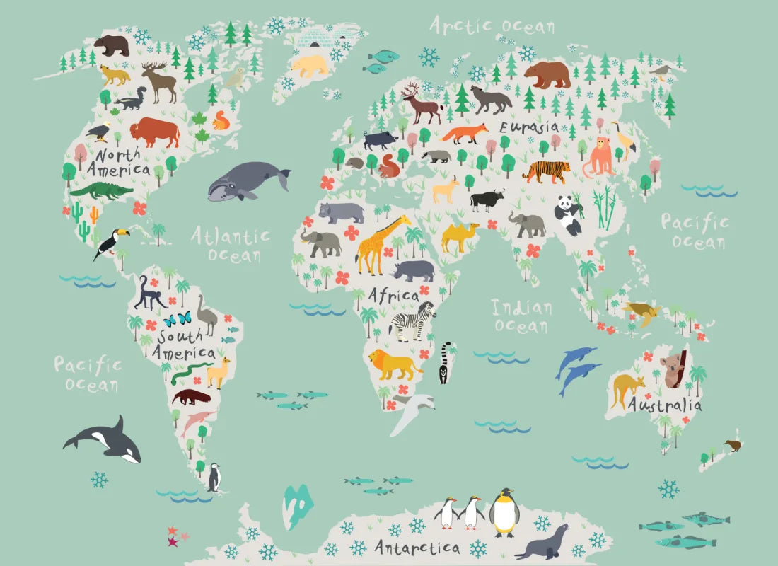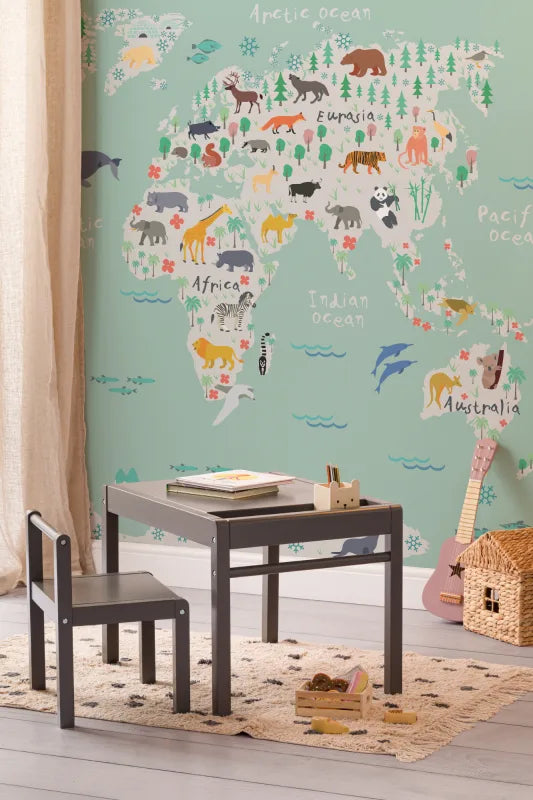 This sweet pastel tones in the Safari Kids Map Wallpaper Mural is perfect for your little one's nursery or bedroom, featuring illustrated animals from all over the world in a cute and educational style. This safari childrens map wallpaper features the sea colored in a soft green tone that creates a calm and light color scheme.