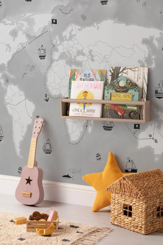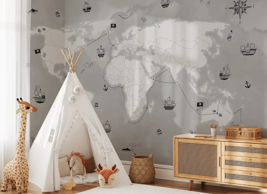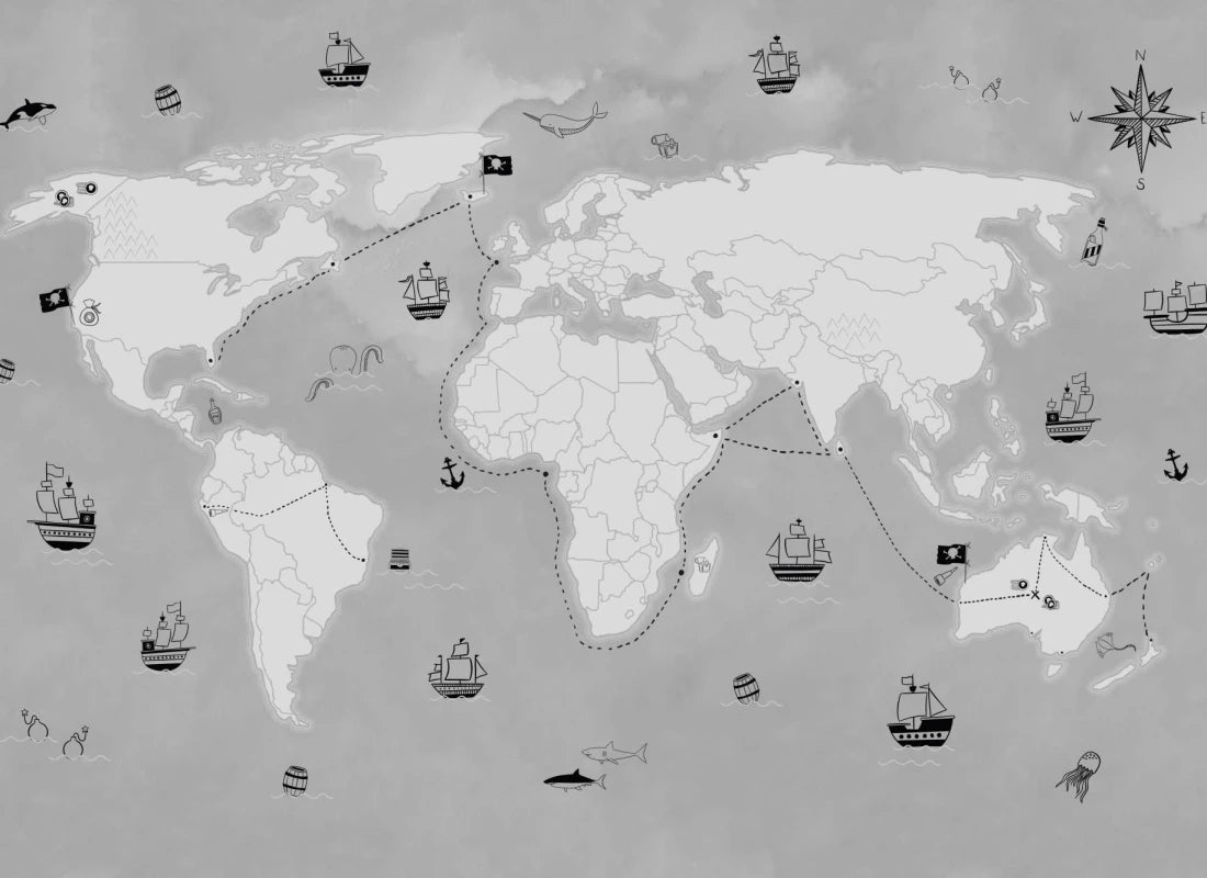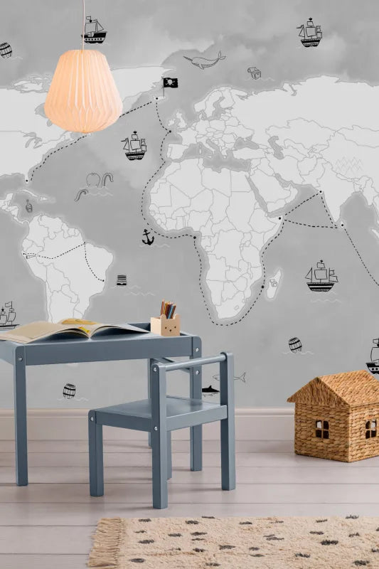 Inspire your child’s imagination through their bedroom or playroom decor, with this stylish Gray Kids Pirate Treasure Map Wallpaper Mural. Perfect for adding depth and character to their space, this mural created in-house features a cool watercolor background, layered with illustrated fictional pirate details including pirate ships, whales, sting-rays, treasure, anchors and more. The subtle gray and white tones means that the mural won’t completely take over the space, allowing you to experiment with fun colors in your complementing furniture.