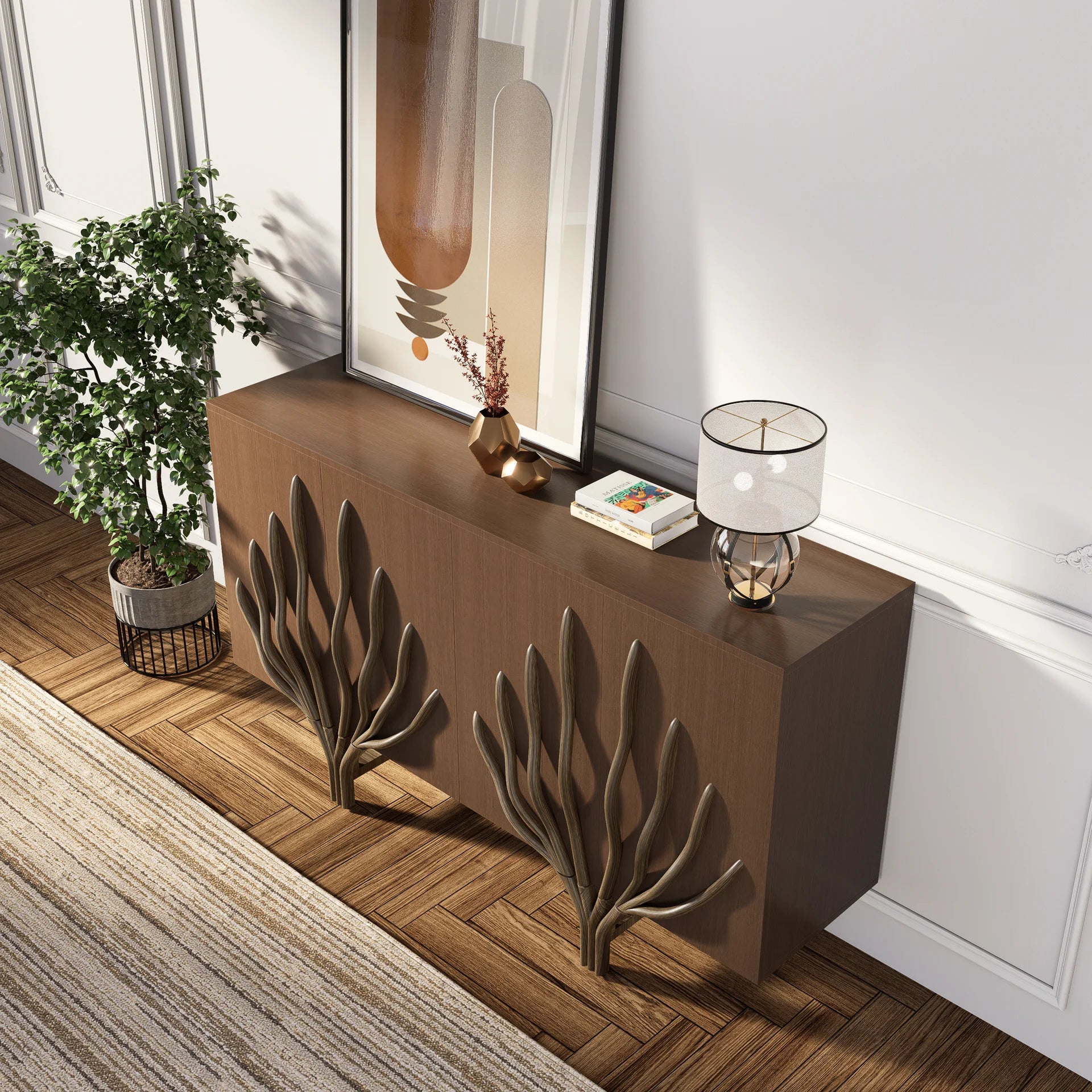 This mid-century modern cabinet features clean lines and unique solid wood branch decorations. Crafted from durable MDF with a smooth finish, it offers ample storage space while adding a touch of natural artistry to any room. Perfect for the living room, dining room, or bedroom.