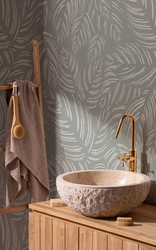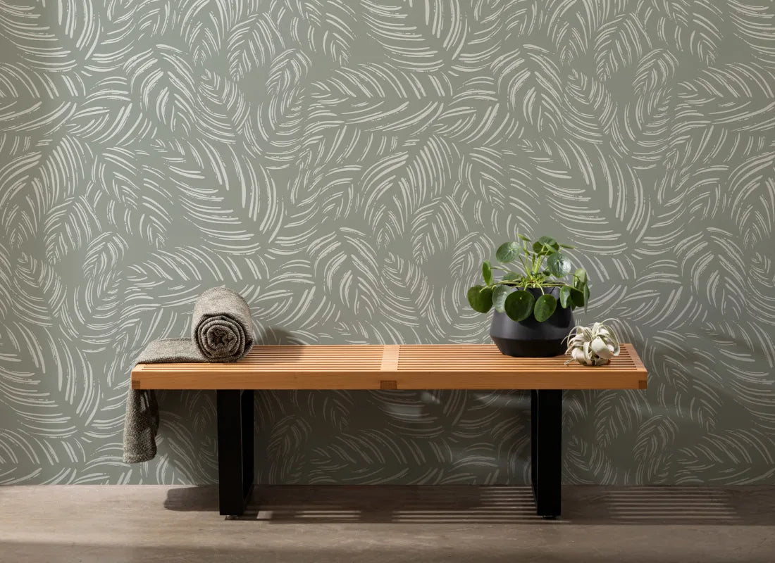 Inspired by calathea plants, our Synthesis Sage leaf mural is a hypnotic pattern that combines nature and modern design. We’ve hand-drawn this minimalist wall mural with a textured brush, layering up the leaves in a subtle, ‘barely there’ style. The light green line details stand out softly against the warm sage green background, and the paper texture over the top completes the design with an organic look. We recommend the Synthesis Sage mural as a calming way to spruce up your bathroom and bedroom walls.