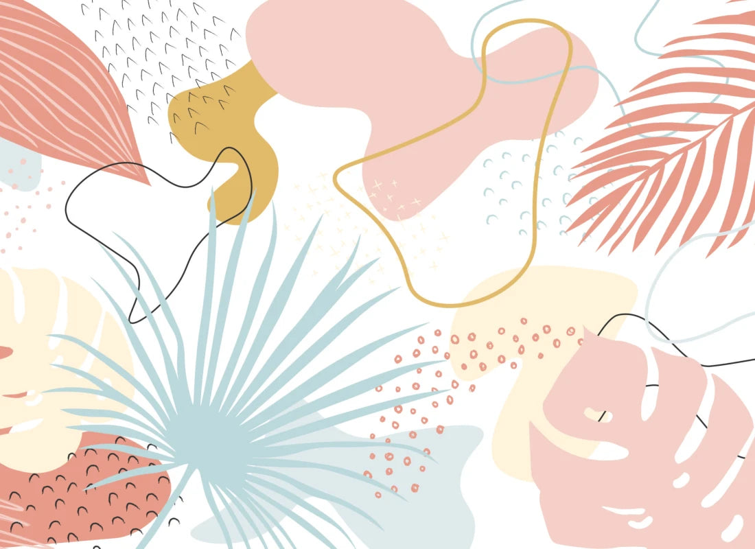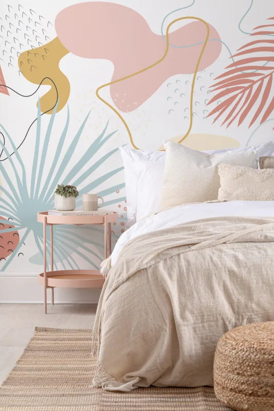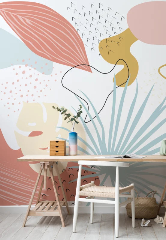 Atop a crisp white background are the magnificent colors and shapes of our pink and blue abstract tropical wallpaper. The Tahiti design brings together filled leaf shapes, abstract doodles, and creative patterns to create a design that is modern, colorful, and impactful. With pastel pinks, dusty blues, faded yellows, and more, the tones of this piece help bring the mural to life and will help to open up your space.