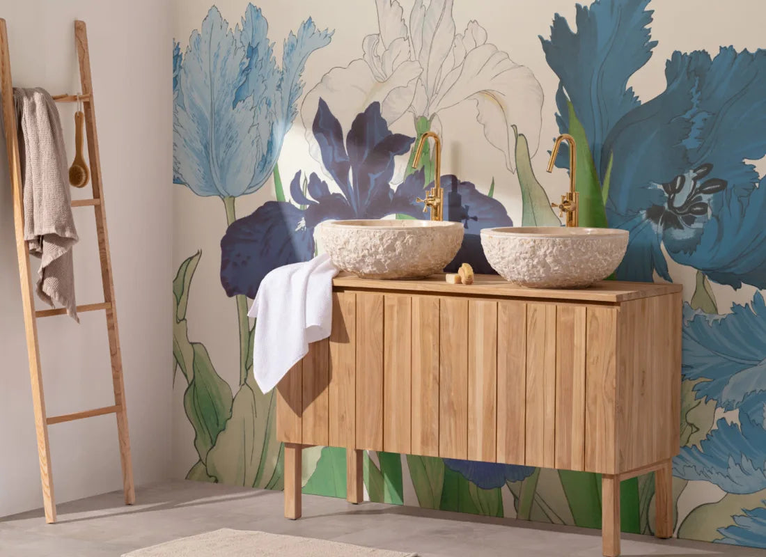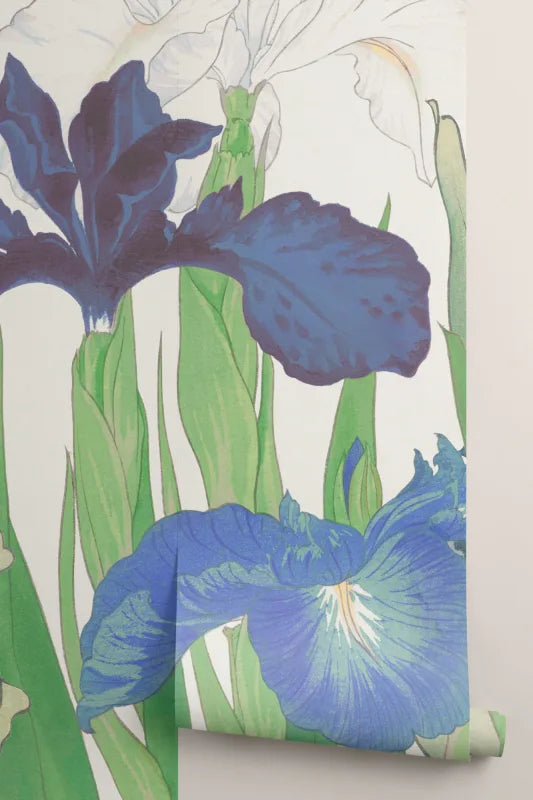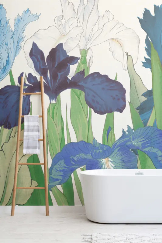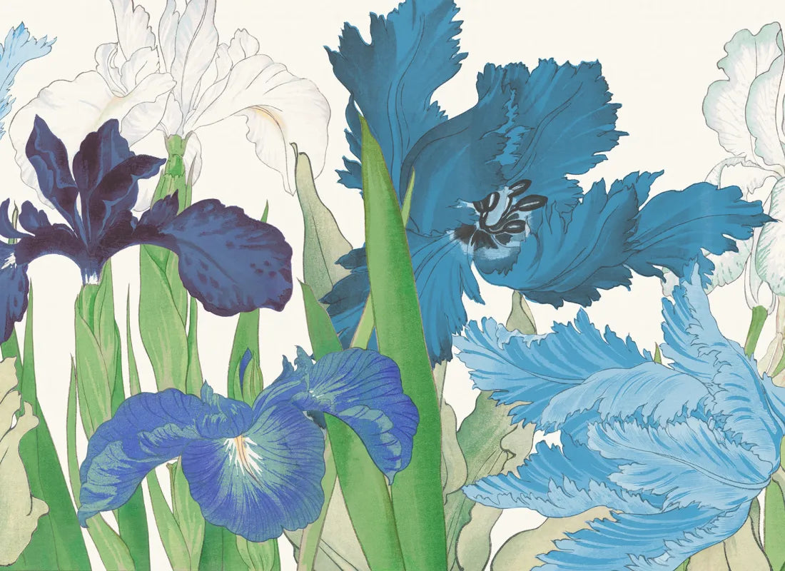 Our Tanigami Cool mural combines delicate elegance with eclectic maximalism, inspired by 1917 Japanese woodblock prints. Cool-toned flowers like Parrot Tulips and Irises grace the design while the vintage woodblock texture on a paper background adds depth. Its harmonious rich blue color scheme suits various rooms, from living rooms to bedrooms and modern offices, adding the perfect sophisticated touch.