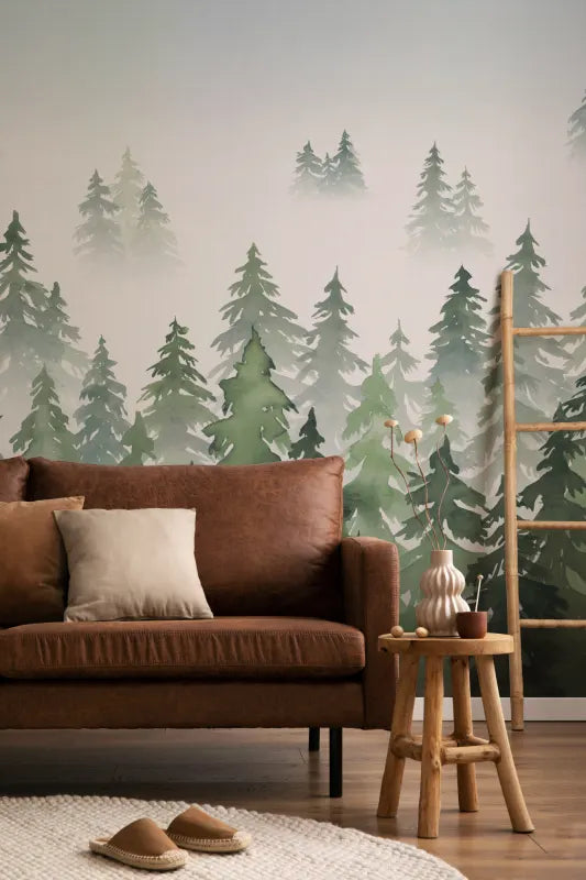 Get lost in the calm, misty woodland of our Tylöskog design and enhance the atmosphere and dimensions of your space. This green watercolor silhouette tree forest wallpaper inspires a refreshing and soothing environment whilst making a big impact on your interior design. The watercolor painting technique used to realize this design brings the depth of a real forest to the mural with the brilliance of the various green tones. Partnered with the neutral-toned, misty sky, this design is eye-catching and breathtaking. Create an expansive effect in your bedroom, bathroom, living area, corridor, or home office and use wooden furnishing for complimentary decor or metallic furnishings for contrasting decor.