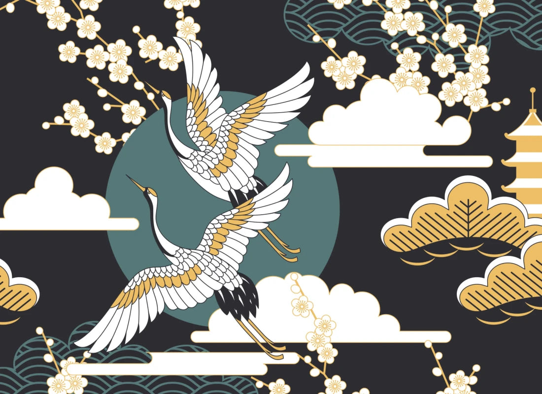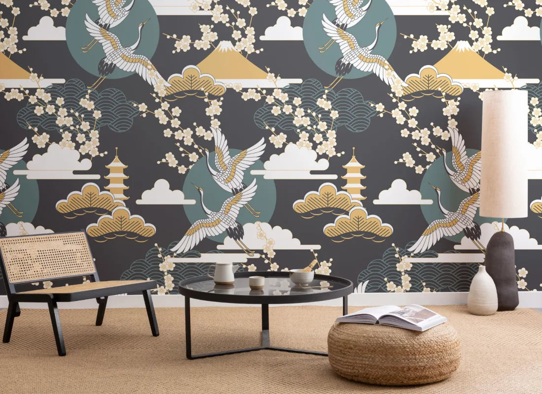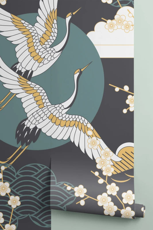 From a still black background, this breathtaking Japanese style scene comes to life in colors of green, gold and white. The Wings mural uses this color scheme to showcase the magnificent blossoms, birds, clouds and Japanese architecture. Our in-house designer of this dark sky Oriental wallpaper has made sure to capture effortless elegance in the pattern as well as intricately detailing the animal and floral elements of the design. This mural brings with it a soothing atmosphere whilst having a stylish impact on your home.
