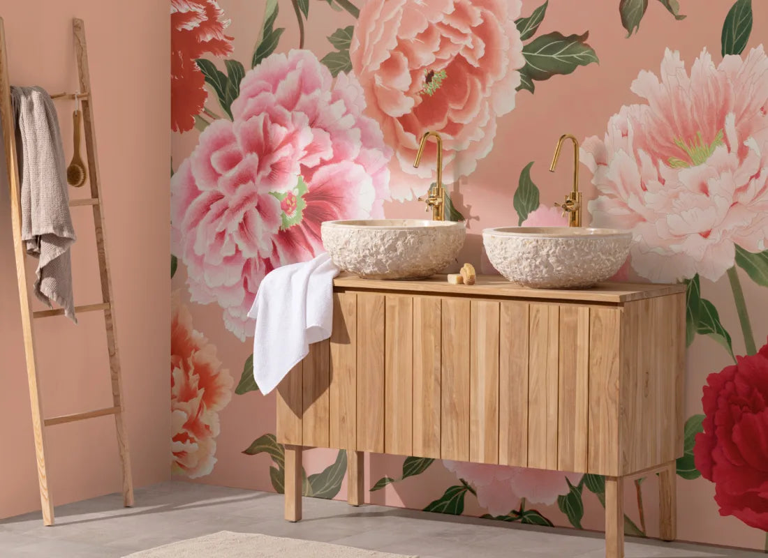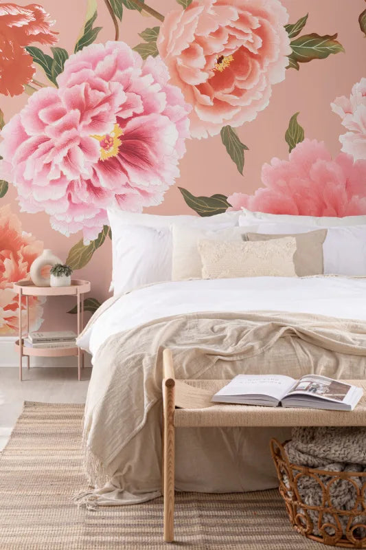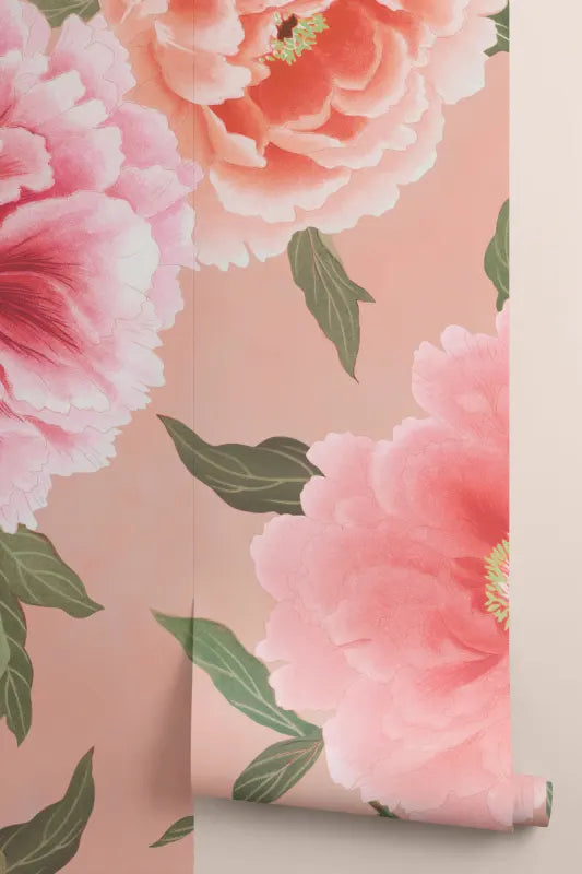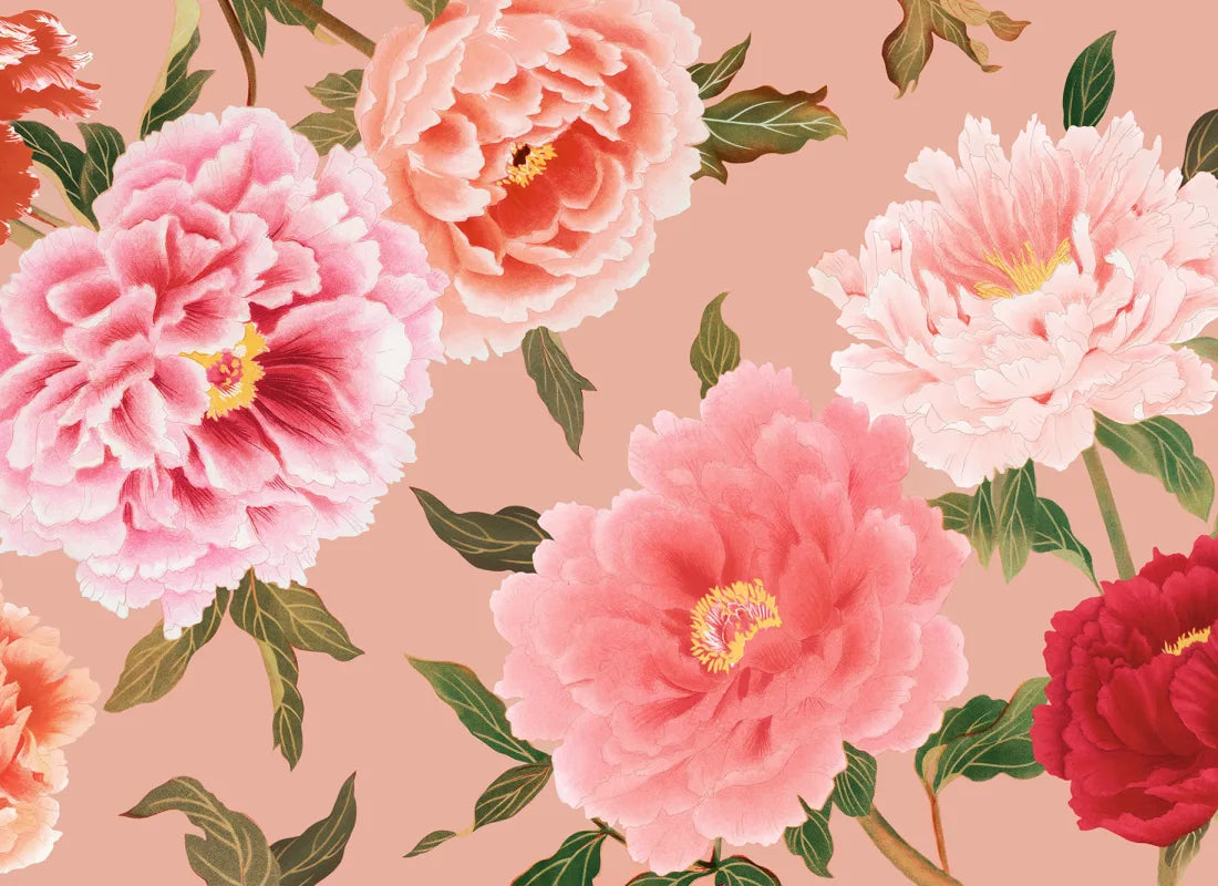 Our Zakura mural is a vibrant design with lots of amazing details. The wallpaper mural features several large peony prints in red, pink and coral tones. These Japanese illustrations have been digitally enhanced to allow them to bloom in high quality on a large accent wall scale. But we’ve kept the original details of the florals, too, such as all of the dotted paint and canvas textures of the old prints – meaning the mural maintains a beautifully vintage look. The intricate textures of the peonies contrast with the simpler tones of the peach background, creating a fresh and modern feel.